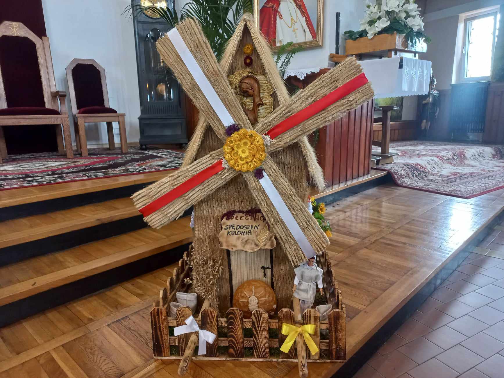Parafianom ze Spędoszyna – kolonii dziękujemy za piękny wieniec dożynkowy i za dar ołtarza w postaci chleba a organizatorom dożynek gminno – parafialnych za owoce i wino mszalne. W przyszłym roku wieniec dożynkowy wykonają parafianie ze Spędoszyna – wsi.
